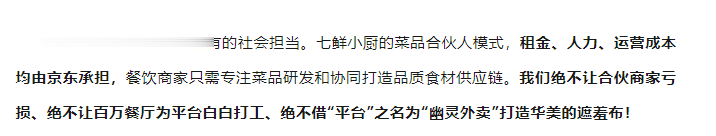 这一声明耐人寻味,不禁让人联想到不久前才开店的京东七鲜小厨。七鲜小厨的模式就是自营外卖,京东自己亲自下场参与餐饮市场。